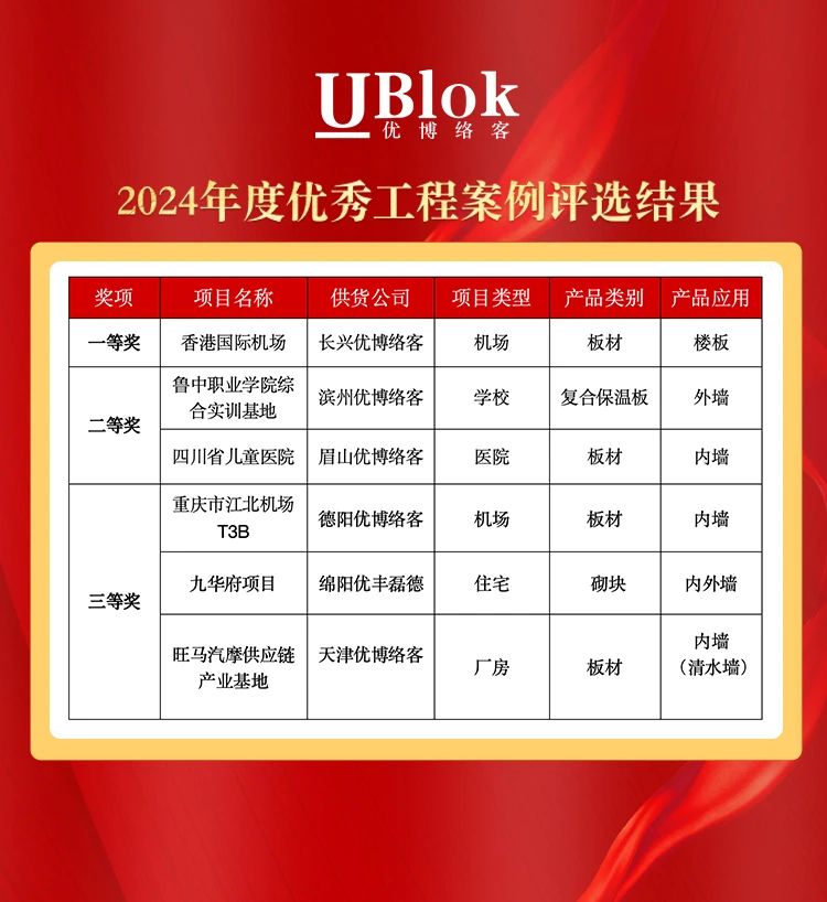 In 2024, with the joint efforts and witness of all partners, the production and sales volume of UBlok exceeded 6 million cubic meters for the first time, reaching a new historical high. Among them, there are quite a number of outstanding engineering cases with certain representativeness and influence. This solicitation activity for outstanding engineering cases has received enthusiastic contributions and strong support from partners. Through strict screening in terms of project scale, technical difficulty, and project influence, a total of 16 outstanding engineering cases were shortlisted. Through a combination of online voting and offline evaluation, first, second, and third - prize projects were comprehensively selected. Now, the selection results are announced as follows: